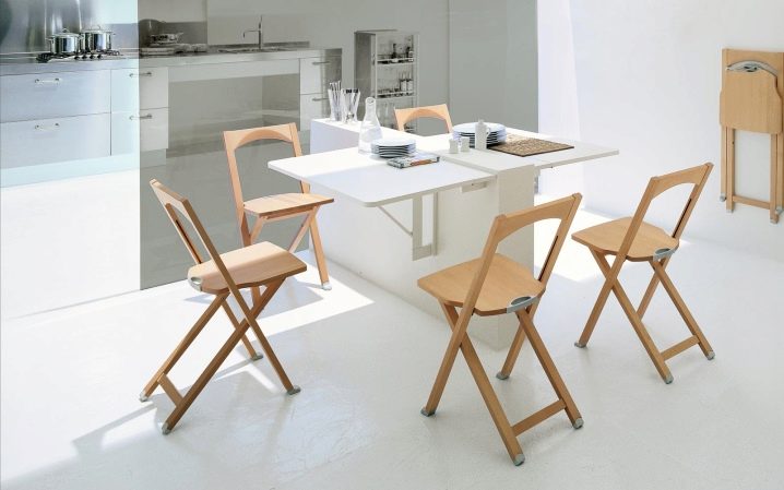 Зоната за хранене трябва да бъде избрана, като се вземе предвид броят на живеещите хора. В кухни с площ от 8 кв. м, малки правоъгълни или кръгли маси и леки столове са по -подходящи. За да спестите място, можете да използвате сгъваема маса и сгъваеми столове.