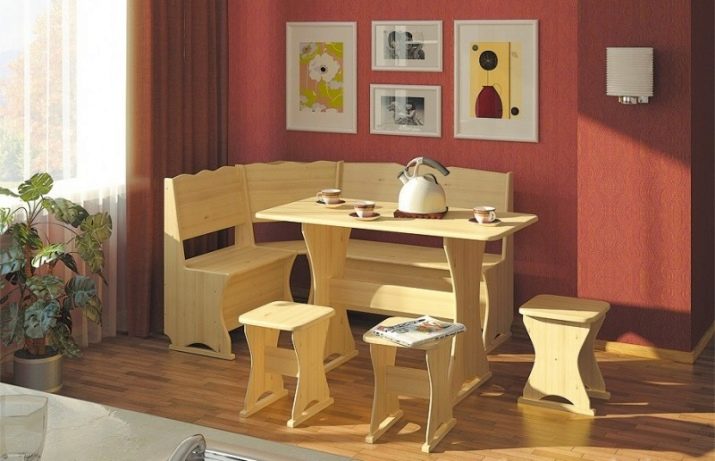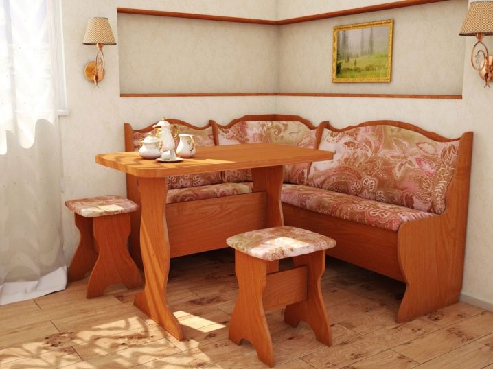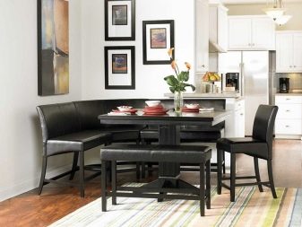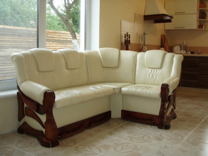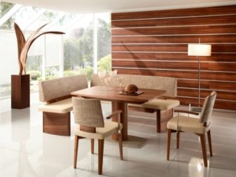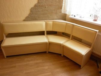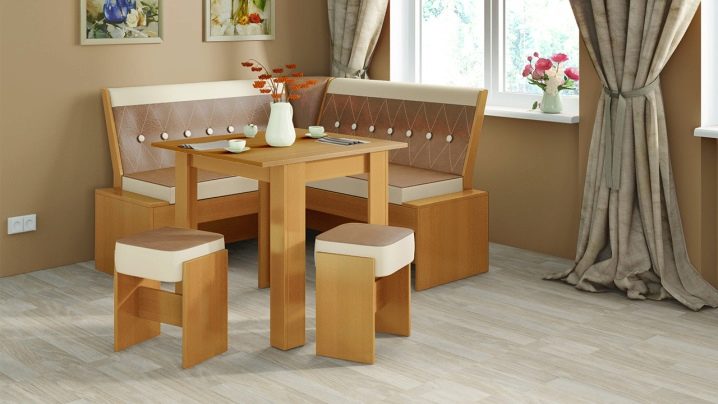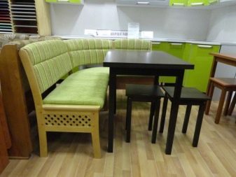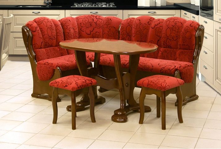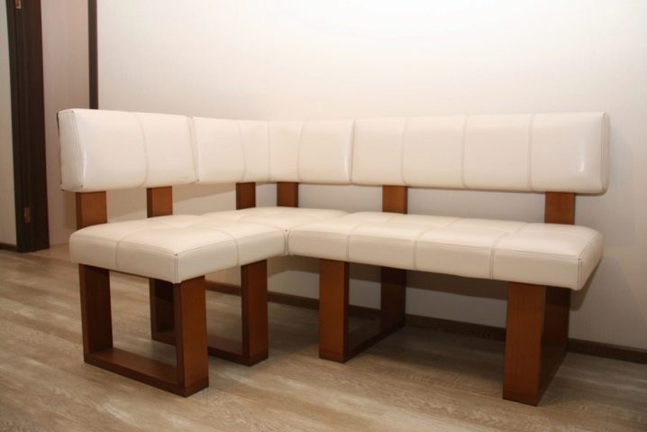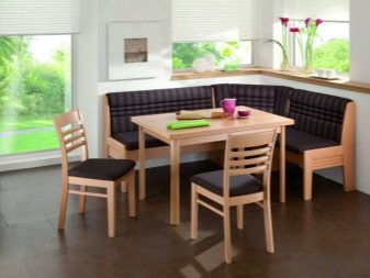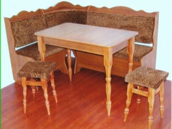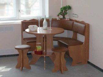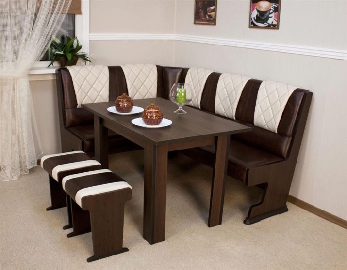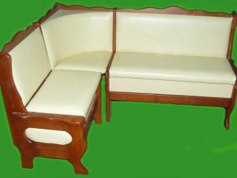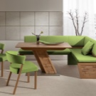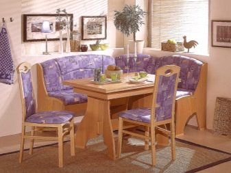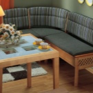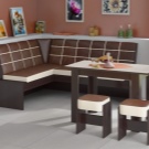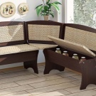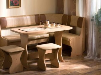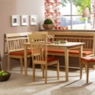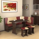 Важна част от ъгловия кухненски комплект мебели е компактен диван: стандартна права, Г-образна или обгръщаща маса с буквата П. Изработена под формата на обикновена пейка с твърди седалки и прави облегалки, тя заема малко място и е евтино, но далеч не е удобно. Неговите братовчеди с мека тапицерия са много по -удобни и представителни, макар и по -малко практични в условия на висока влажност, температурни крайности и системно замърсяване, присъщи на кухненския бокс..