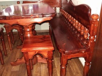 Кухненски ъгъл от масивно дърво, декориран с филигранна резба или странни детайли, но направен под формата на дървена пейка без тапицерия, разбира се, ще украси вашата кухня в селски или селски стил. Но е малко вероятно да бъде възможно да се яде с чувство, ясно и с уговорка – ще бъде трудно и неудобно.