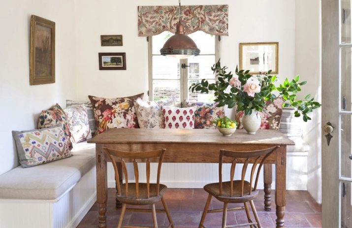 Съвет: ако стриктното спазване на стилистичния дизайн на стаята ви надделява над комфорта, шийте подвижни меки възглавници за твърдата пейка на кухненския ъгъл с красиви етнически мотиви и бродирани или дантелени щампи, които подкрепят дизайнерската идея на интериора.