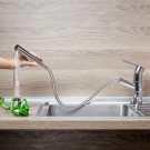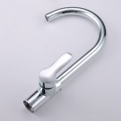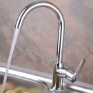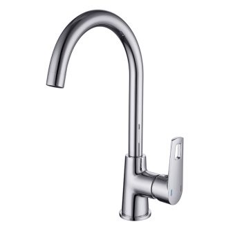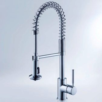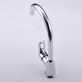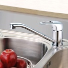 - Руно. Модел с един лост за кухненски мивки. Материал на корпуса – месинг и хром. Устройството с традиционна форма на чучура, има гъвкав тип облицовка, керамичен патрон, пластмасов аератор. Красивият и изтънчен дизайн ще се впише идеално в модерна кухня в стила на “хай-тек”, “минимализъм”. Цена – 4,6 хиляди рубли.