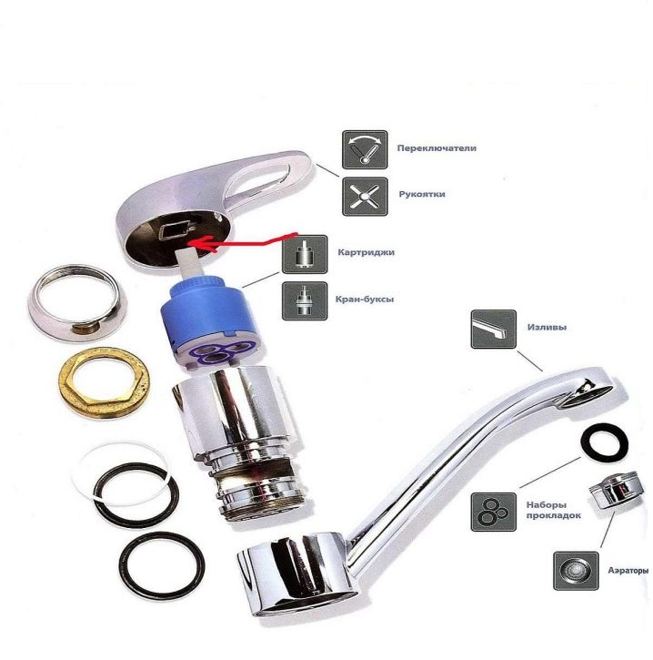 Механизмът на смесителите с един лост на различни модели няма фундаментални разлики. По принцип има: