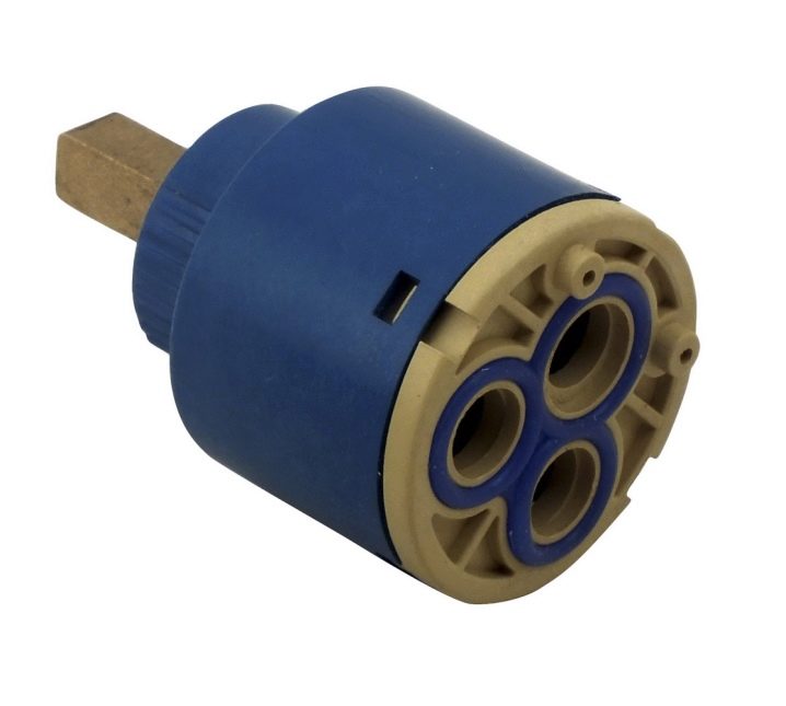 Керамични. Тези модели са признати за по -добри от аналозите на топката по отношение на издръжливостта. Разликата между тънките керамични плочи, съставляващи нейната основа, е по -малка от молекулите на водата, поради което върху повърхността на керамиката не се образува плака. Относително ниската цена на такива части допринася за тяхната популярност. Единственият недостатък на този тип патрони е неговата чувствителност към фини частици като пясък. Използването на керамични патрони заедно с филтри за груба вода може напълно да реши този проблем..
