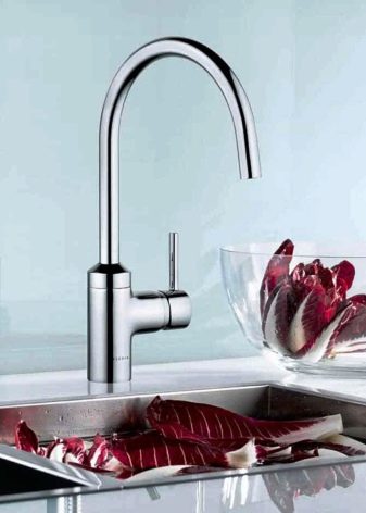 Освен това крановете се различават и по височината на чучура. Височината се избира субективно и зависи от личните предпочитания и размера на мивката. Така че за кръгла дълбока мивка е по -добре да изберете модел с висок чучур, който е много удобен не само за миене на съдове, но и за пълнене на вода в различни контейнери. Не забравяйте за параметрите на собствения си растеж – твърде високият чучур ще допринесе за изтръпването на мускулите на ръцете и шията. Оптималната височина е 15 см..