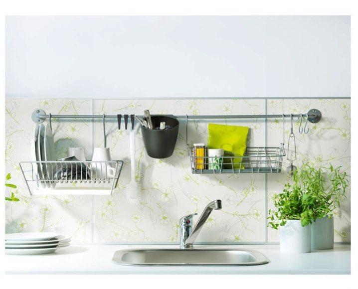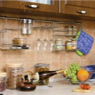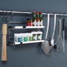 Ако пространството позволява, на хоризонталния парапет можете да поставите висяща кошница за хляб, сушилня за чинии, мрежест рафт за прибори за хранене. Удобно е да закачите фитингите на стъкления държач на високо монтираната шина. Изглежда особено изгодно пред бар брояча. Удобно е да се редуват рафтове и куки – това ви позволява значително да спестите място. Освен това хоризонталната лента е удобна за използване като държач за големи капаци..