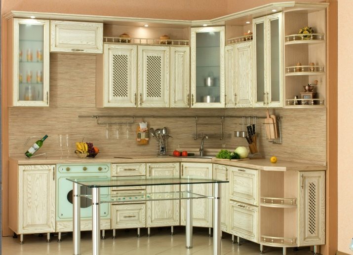 В просторна кухня дълга шина по цялата стена или над работната повърхност ще изглежда добре. Ако имате ъглова мивка, тогава има смисъл да изберете ъглова конструкция и да инсталирате рафтове върху нея за удобно съхранение на перилни препарати, гъби или прибори за хранене..