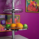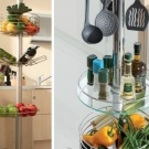 Фитингите за бутилки и кръгли, въртящи се рафтове, където можете да поставите плодове, да подредите чай, кафе или да поставите чифтове и комплекти чай, ще изглеждат ефектно върху вертикален парапет, фиксиран върху бар или плот..