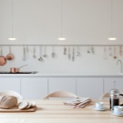 За кухня от островен тип висящата релса е отлично решение – тя решава проблема с липсата на просторни шкафове за съдове и идеално се вписва в стила на интериора.