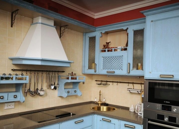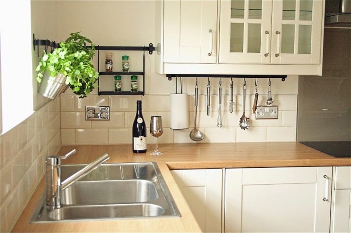 В малка кухня, голям брой шарнирни конструкции и висящи върху тях кухненски прибори само ще създадат усещане за затрупване и ще донесат допълнителни неудобства. Затова за малките стаи е по -добре да изберете къси релси на покрива и да поставите най -необходимите неща върху тях – шпатули, ножове, кърпи, подправки..