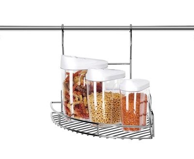 Ъгловата шина е оформена от две хоризонтални тръби с помощта на допълнителен ъгъл 90. По този начин е удобно да се монтират ъглови рафтове с мрежи за съхранение на малки предмети или препарати за миене на съдове.