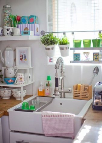 Например, малки саксии с истински или изкуствени цветя могат да бъдат поставени на окачени рафтове на добре осветена стена. Виолетки, цикломени, гербери на закрито, жасмин или цъфтящо каланхое са идеални за това. Можете също да отглеждате зеленина в тези саксии сами – маруля, лук или копър. Просто не поставяйте живи растения твърде близо до котлоните и аспираторите..