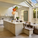 - оформление на острова. В основата му, както подсказва името, е остров. Това е централната част на кухнята, в която се намират мивката и прилежащият плот. Отстрани на тази обособена част има кухненски комплект, маса и печка. По правило местоположението на функционалните части може да се променя, но не се препоръчва да се монтира фурна в средата на кухнята – това противоречи на правилата за пожарна безопасност и струва скъпо по отношение на парични инвестиции;