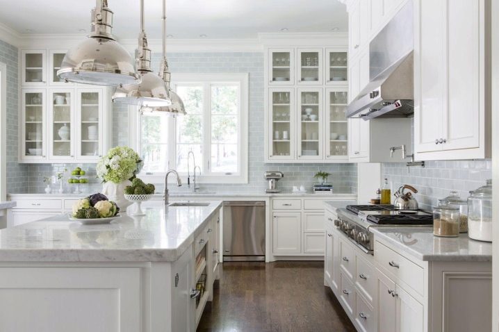 Например, използването на светли нюанси в стаята визуално разширява пространството. Необходимо е да се разбере, че кухнята с площ от 9-10 кв. м, ще изглежда много по -хармонично и по -широко, ако общият цвят на мебелите и стените е бял. В този случай престилката е създадена или по -лека, или да съответства на слушалките.