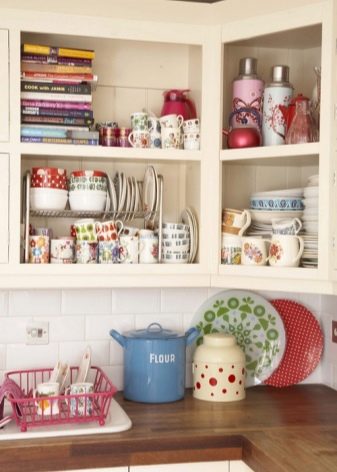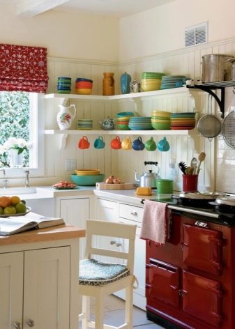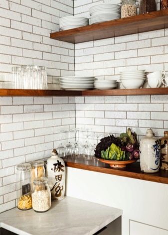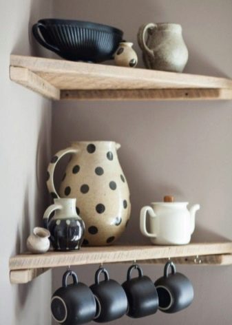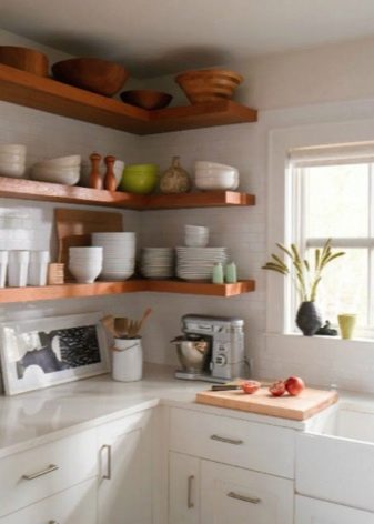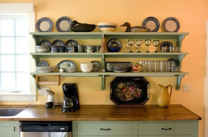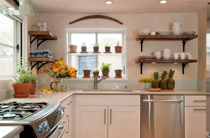 За тези цели можете да използвате боя, лак, залепващ филм. Цветът на рафта трябва да бъде избран въз основа на цялостния стил на кухнята. Дървените рафтове могат да бъдат лакирани, ако структурата на дъските има привлекателен външен вид.