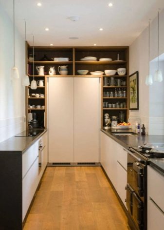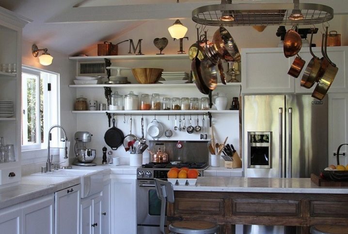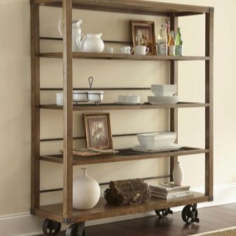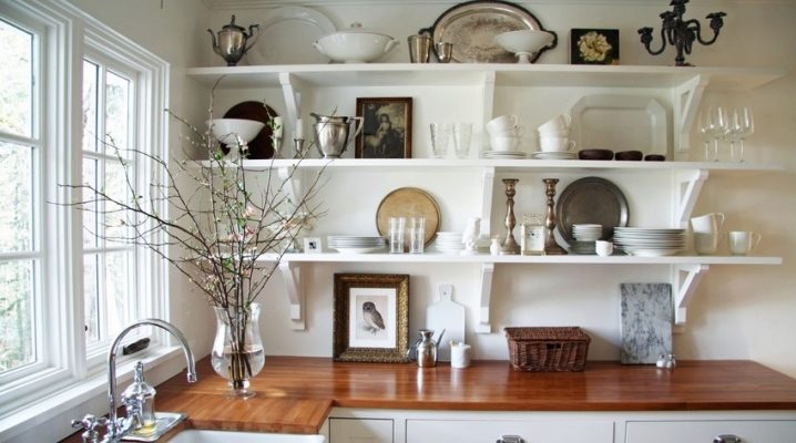 И не трябва да забравяме за най -лесния начин за инсталиране на рафтове. Можете просто да го поставите на пода на всяко удобно за вас място. Така наречените „купчини“ могат да се състоят от няколко повърхности, свързани с колони с различни форми, но могат да имат и слепи задни и странични стени. В първия случай дизайнът изглежда деликатен и прозрачен, а във втория масивен и надежден. Какво е най -добро за вашата кухня, зависи от вас, разбира се..