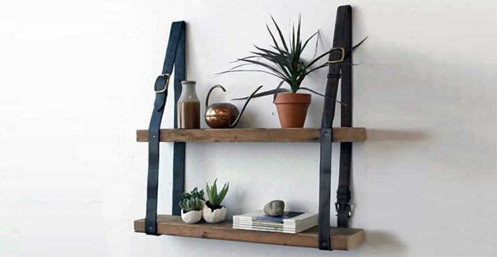 Тази опция за монтаж съчетава простота на изпълнение и много място за въображение едновременно. Преценете сами, за да фиксирате шарнирния рафт, достатъчно е да забиете два пирона в стената и да използвате различни видове и цветове канап, въжета, въжета и дори аксесоари за мъжки гардероб (закопчаването на основата на стари колани за панталони) беше разгледано по -горе) можете да постигнете голямо разнообразие от форми.