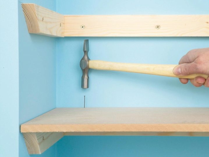 В тези случаи е достатъчно да се използва всяка опора, която може да служи като пръти, заковани или закрепени към стените. В най-простия случай можете да забиете пирони с дюбели или да завиете винтове (самонарезни винтове), оставяйки ги да стърчат 1-2 сантиметра. В този случай рафтът просто се поставя отгоре..