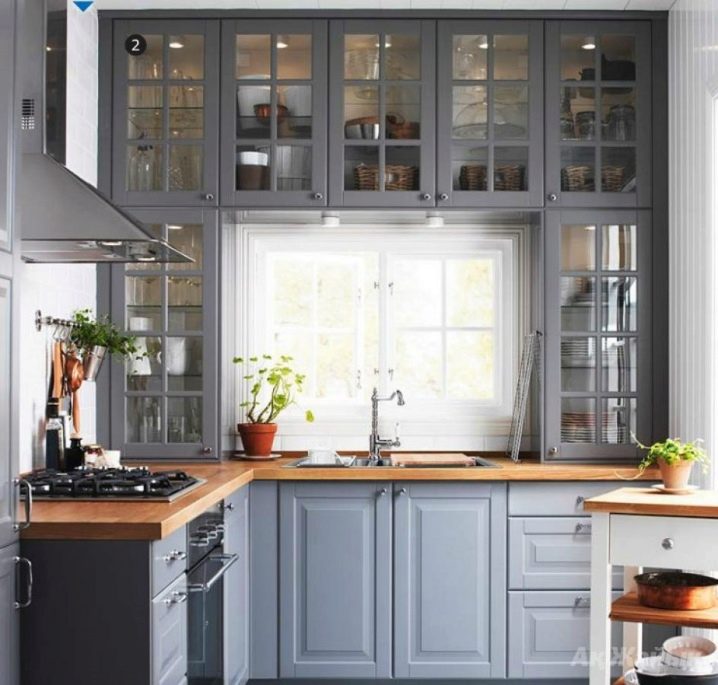 Можете също така да избирате от врати от лято дърво или стъклени вложки. Вторият вариант ще направи вашата кухня по -лека и по -ефирна, но не забравяйте за постоянния ред в шкафовете, защото съдържанието им се вижда отлично зад прозрачното стъкло..