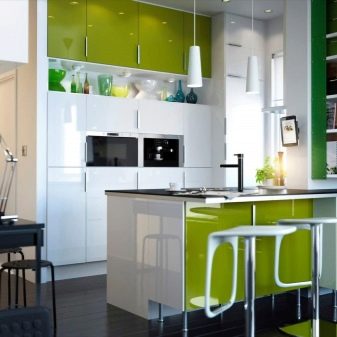 Ако сте собственик на малка кухня, тогава е по -добре да изберете шкафове с лъскава повърхност. Благодарение на отразяващия ефект, кухненското пространство визуално се увеличава.