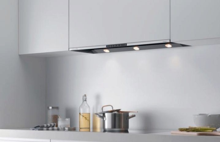Вградените абсорбатори са изключително компактни и спестяват място в малка кухня. Достатъчно е просто да ги вградите в един от кухненските шкафове. Често панелът на такъв абсорбатор е оборудван с осветление, което прави готвенето на любимите ви ястия още по -удобно и елиминира необходимостта от включване на централното осветление. Това е известна икономия на енергия, тъй като точковото осветление не изисква големи енергийни разходи..