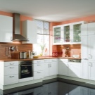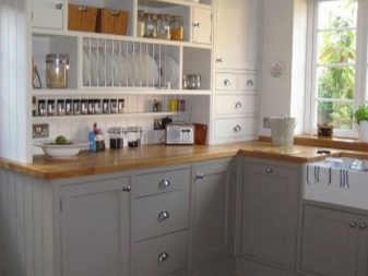 - За средни и големи кухни тази компания предлага отворени рафтове вместо стенни шкафове. В някои опции за дизайн има шкафове, но или те са много малко, или заемат не повече от половината.