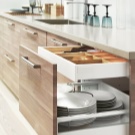 - Повечето от полезните мебелни фитинги са произведени от австрийската компания Blum. Той гарантира високото качество на плъзгащия механизъм на чекмеджетата и издържа на тегло 15-25 или 60-70 килограма, в зависимост от серията. В допълнение към тях можете да закупите вложки за органайзер, но това ще струва повече.