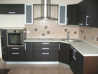 - Сега е необходимо да въведете кухненските мебели в полученото свободно пространство. Помислете не само за долния ред, но и за горните шкафове, качулката.