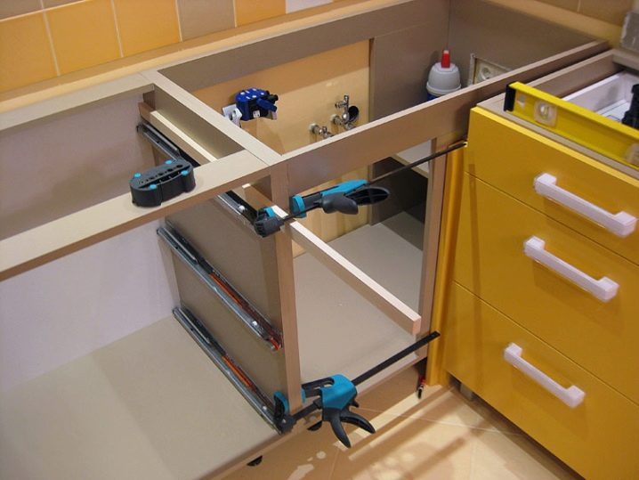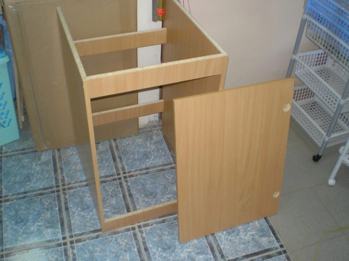 Краката са монтирани на напълно сглобен и обърнат шкаф. Инсталирането на предната част е необходимо последно, след което те са прикрепени към пантите към страничната стена.