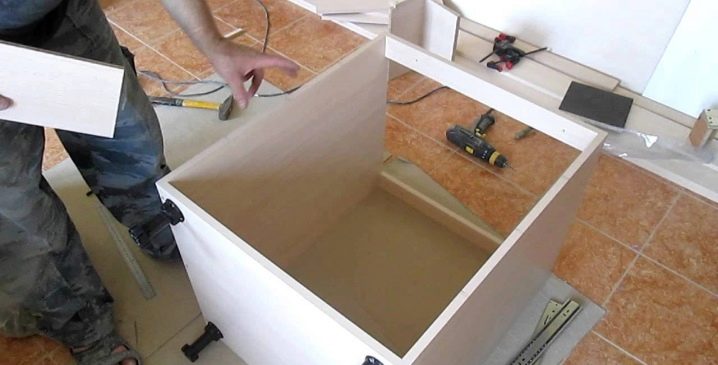 Шкафчетата са сглобени като кутия. Вертикалните странични стени трябва да бъдат прикрепени към долната хоризонтална повърхност. Капакът се завинтва последен..