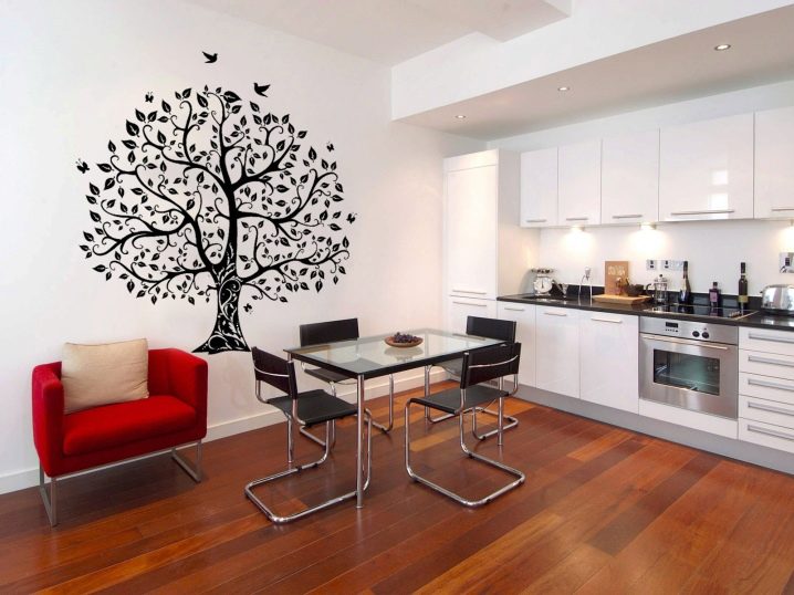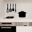 Такива декоративни елементи могат да придадат на мебели или отделни елементи ярък акцент. Интересни стикери се продават в различни магазини или можете сами да ги изрежете от самозалепваща лента. Декорирана зона над масата, върху престилката или над работната повърхност ще добави стил към интериора на кухнята.