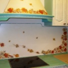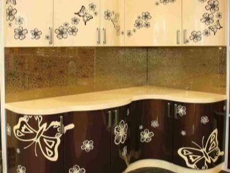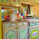 Рисуването с шаблони изглежда много стилно върху кухненските мебели. Можете да направите модел от дебел картон или пластмаса и да направите оригинален орнамент. Картината с артистичен характер ще изглежда много стилно.