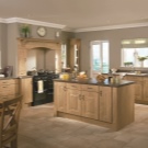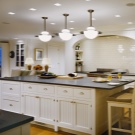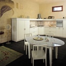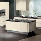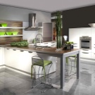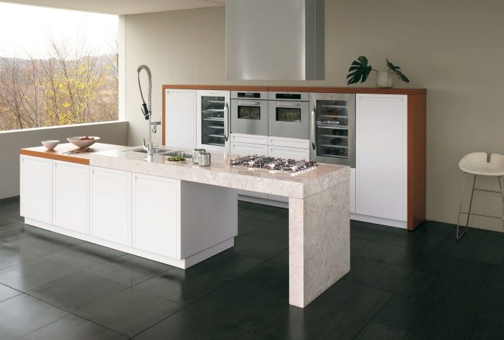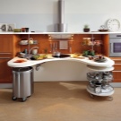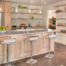 - Островно оформление. Тази опция за дизайн е подходяща за големи кухни. В центъра на кухнята има бордюр-остров, който поема функцията на основната работна повърхност, а понякога и място за хранене. С този метод на планиране стените на кухнята могат да останат напълно свободни, тъй като мивка, кухненски уреди могат да бъдат вградени в острова, а също така могат да бъдат оборудвани и с кутии за съхранение. Но все пак в повечето случаи такава кухня е оборудвана с допълнителни шкафове, разположени срещу стените..