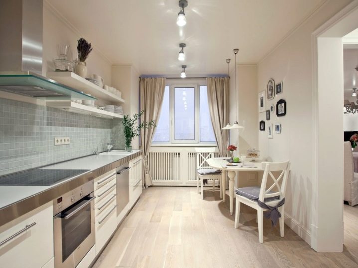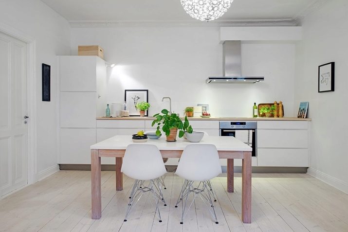 Като такава кухня без горни шкафове няма недостатъци. Съществува погрешно схващане, че такава кухня има малко място за съхранение. Но, както можете да видите, благодарение на внимателния дизайн на долните шкафове, използването на различни мебели с места за съхранение, това съвсем не е така. Единственото неудобство може да бъде необходимостта от по -често изтриване на прах от рафтове и стелажи и отстраняване на различни замърсявания. Но с днешното изобилие от различни препарати, това не би трябвало да е значителен проблем..