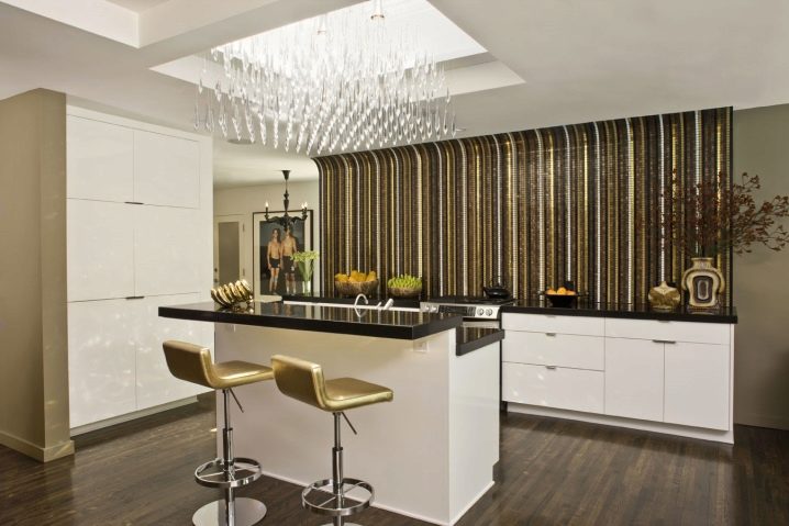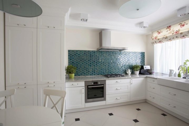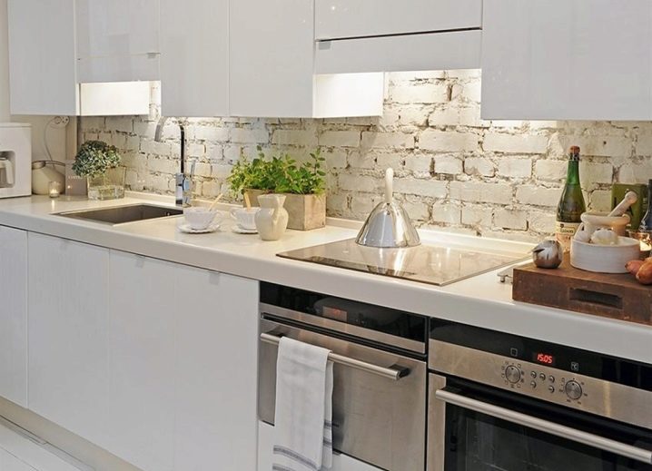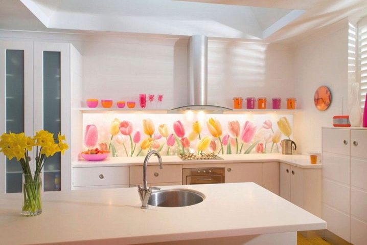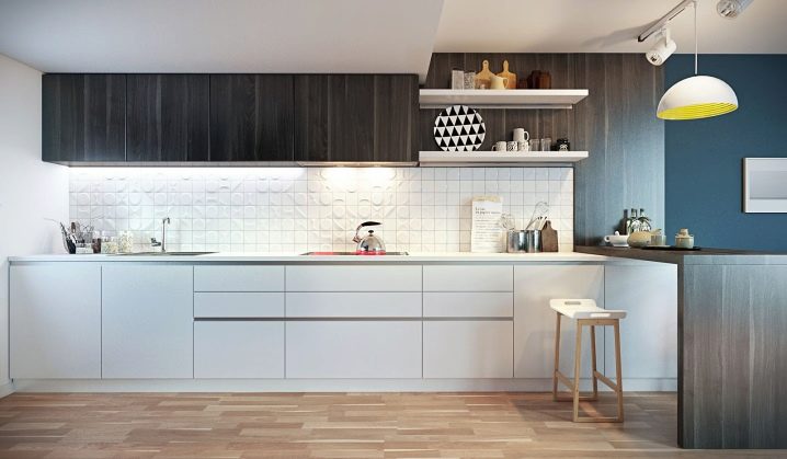 Също така трябва да бъдете много внимателни при избора на кухненска престилка. Липсата на стенни шкафове прави горната област най -видима. Цветовата схема на престилката може да бъде всякаква – от бяла до опции с различни шарки и орнаменти. Основното правило тук е комбинацията от престилка с дизайна на фасади и плотове..