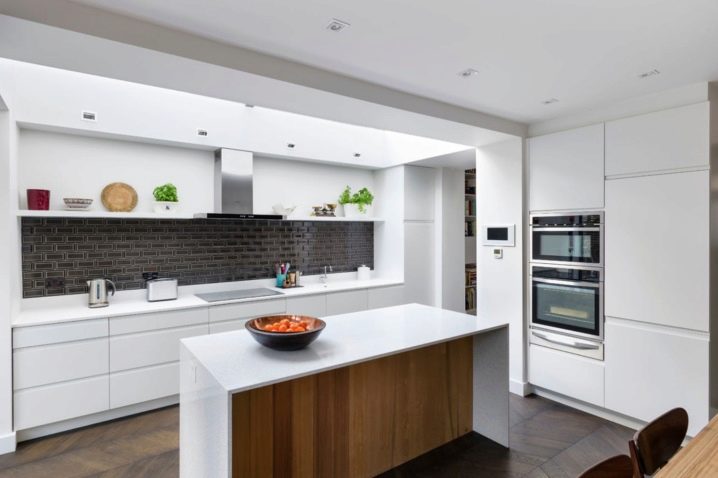 Със своята изтънченост и практичност такава кухня по нищо не отстъпва на обичайните кухни с окачени шкафове отгоре. Това е донякъде нетрадиционен, но много интересен подход, който добавя усещане за ефирност, лекота, лекота в пространството..