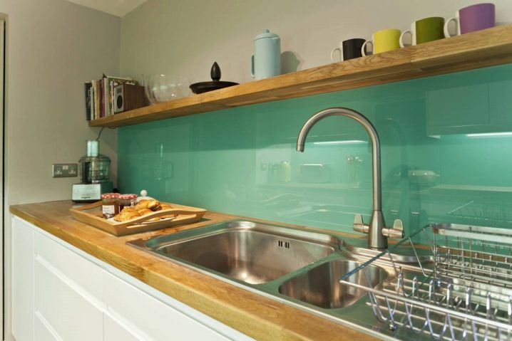 - Стъклени престилки – необичайно и интересно решение. Закаленото стъкло се използва в дизайна на кухнята, който се характеризира с повишена устойчивост на удар, устойчивост на температурни крайности и лекота на поддръжка. Стъклото предоставя неограничен обхват за дизайн: можете да използвате матирано стъкло, прозрачно, с шарки и всякакви шарки. Стъклото с обемна шарка, осветена отвътре, изглежда много впечатляващо. Недостатъците на стъклената престилка включват необходимостта от често почистване и известна крехкост на стъклото..