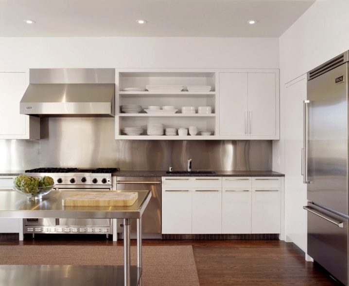 - Метални престилки – идеален за модерен интериор. Характеризират се с повишена здравина, топлоустойчивост и високи хигиенни свойства. Единственият недостатък е трудността да се грижи за лъскава метална повърхност, върху която мръсотията е много забележима. Но решението може да бъде използването на матов, а не лъскав метал..