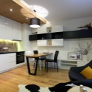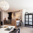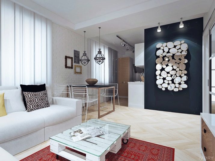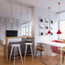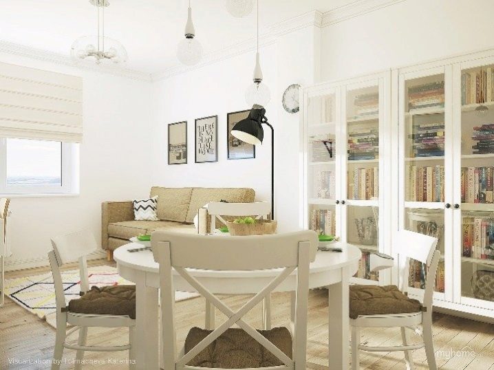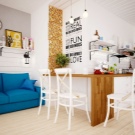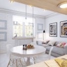 Малка сгъваема маса или бар плот ще се впишат органично в малка кухня – всекидневна със скандинавски мотиви, която отделя зоната за хранене от зоната за отдих.