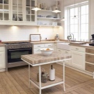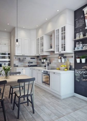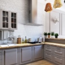 Що се отнася до материала за мебели, пластмасата и хромът не са за този интериор. Тук е подходящо масивно дърво или естествен фурнир. Дървен плот в нюанс на кафе с цвят на мляко или уиски е в перфектна хармония със светла стена и обратно – ако работната стена е тъмна, тогава плотът трябва да бъде избран за разлика от нея. Метални елементи могат да присъстват в интериора, но само като акценти.
