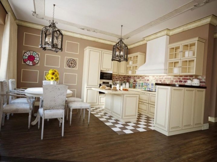 След като сте взели решение за дизайна на основата на кухнята-хола, струва си да преминете към избора на мебели. Тя също трябва да бъде част от този стил. За да поддържате зададения тон, изберете или оригинални старинни мебели, или негова алтернатива – изкуствено състарени дизайнерски артикули..