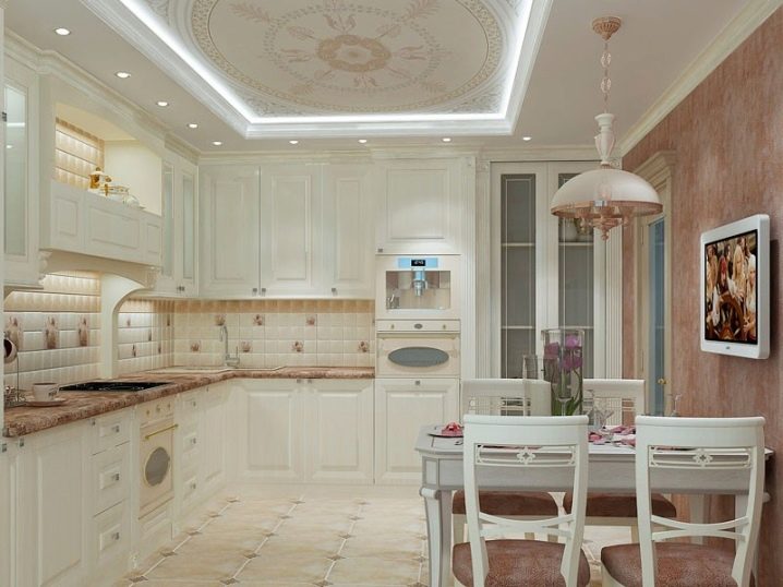 Най-простият вариант за дизайн на кухня-хол в стил Прованс е използването на бяла мазилка, светли мебели и малък брой цветни аксесоари за стените, поставени на видни места..