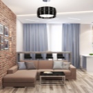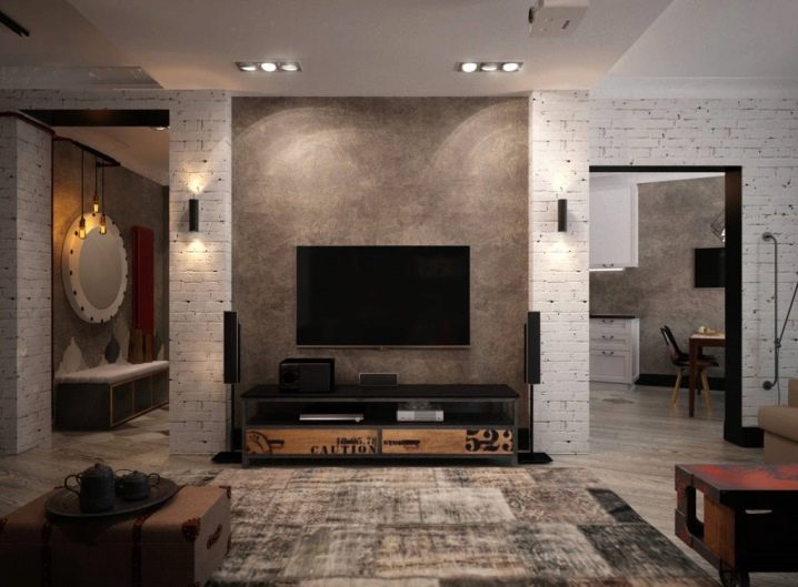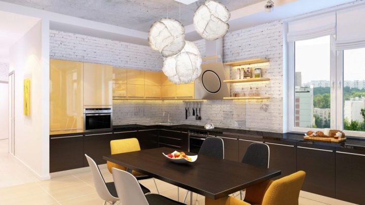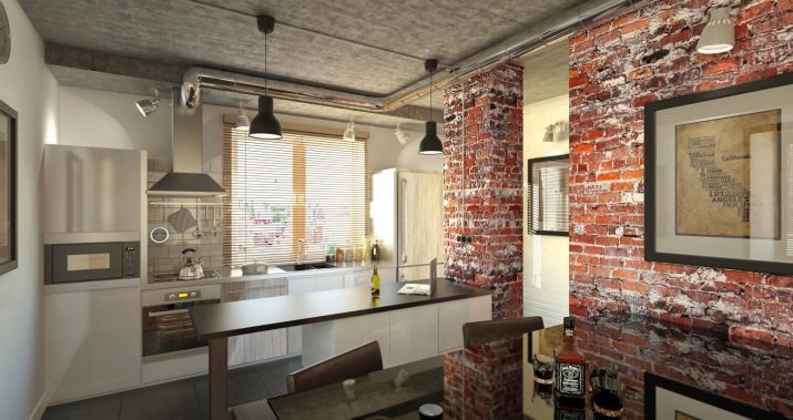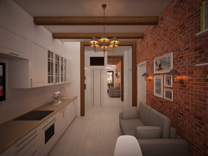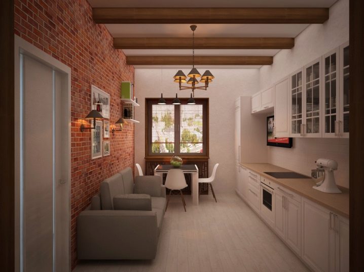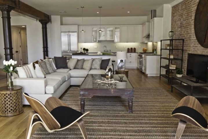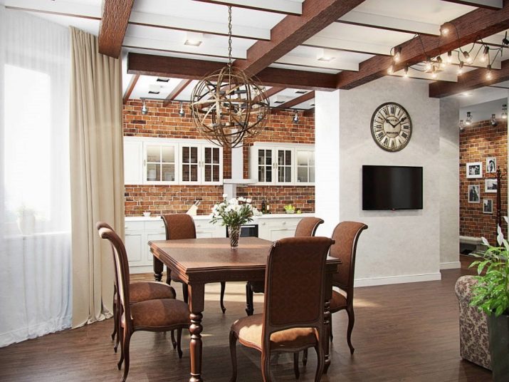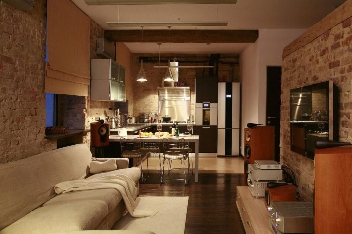 На първо място, за да украсите пространството на кухнята-хола, трябва да направите обновяването на стаята. Най -добре е стените в стаята да имат оригиналния си вид. Тук са подходящи опции като каменна или тухлена зидария или груба мазилка..