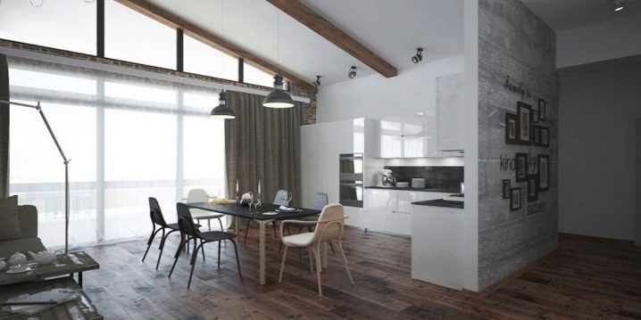 Кухня-хол в този стил е добра с това, че не е нужно да харчите много пари за нейния декор. В същото време получавате огромни възможности за себеизразяване и много свободно пространство. Комбинираните стаи са още един от отличителните белези на този стил. Обикновено в стая в стил таванско помещение няма допълнителни прегради, врати и стени. Следователно пространството може да бъде зонирано от вас, както искате, като използвате различни цветове за всяка зона или ги разделите с мебели и декоративни елементи..