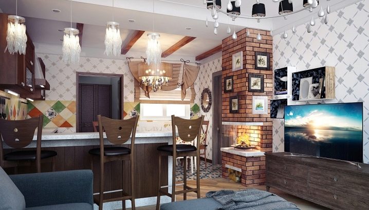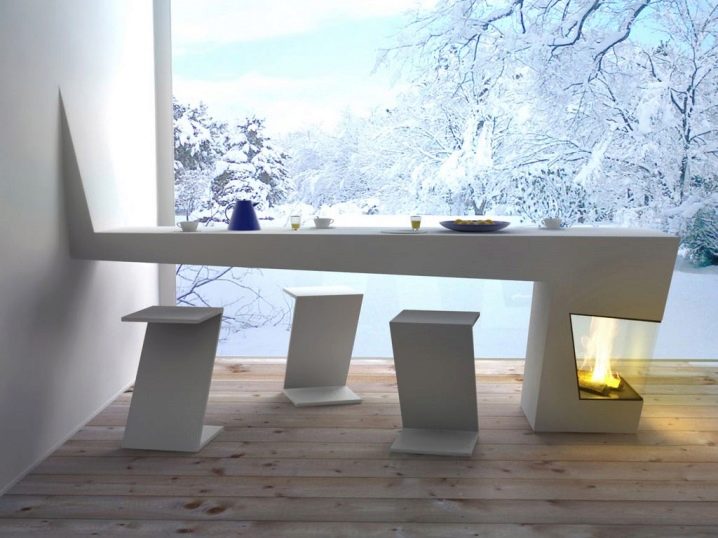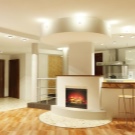 Камината може не само да отоплява стаята, но и да бъде границата между кухнята и хола, като по този начин създава студио. Има много решения. Заедно с бар брояча, камина може да бъде направена или вградена в колона.