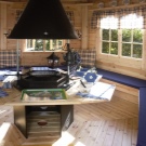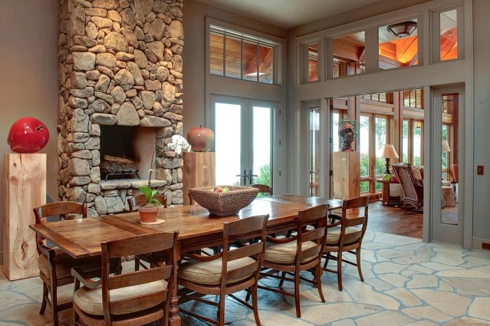 За трапезария, комбинирана с кухня, най -добре е да изберете истинско огнище. Камина с печка не само ще украси стаята, но и ще зарадва любителите на готвенето. Камината ще бъде органично допълнение към голяма масивна маса за хранене..