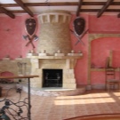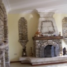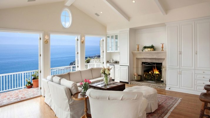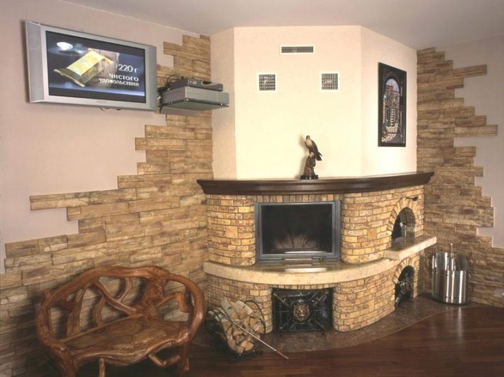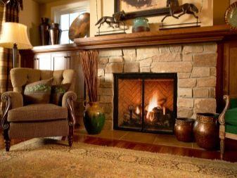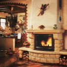 Ловни трофеи или ковани предмети могат да бъдат окачени над огнището. Бяла тухла, камък, облицовка от пясъчник, черупки са подходящи като материал за камина.