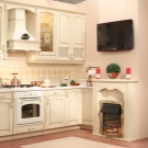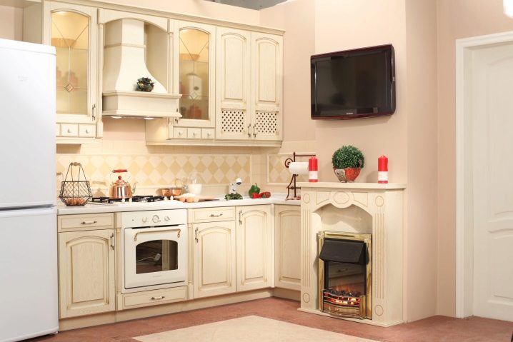 Малка кухня все още не е изречение. Електрическа камина е подходяща за нея. Тя трябва да съответства на цялостния стил и посока. Вместо камина можете да използвате имитация, да инсталирате портал и да го украсите. Или изберете дизайн на ъглова камина.