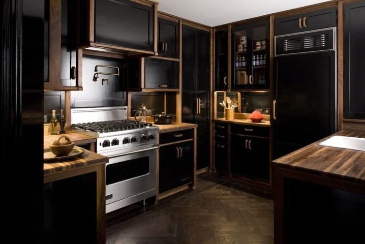 Когато избирате материали за довършване на кухнята, трябва да дадете предпочитание на същите текстури. Ако кухненският под е лъскав, тогава мебелите трябва да бъдат монтирани с лъскав блясък. Вертикалните или хоризонталните ивици по стените ще помогнат за визуално разширяване на пространството на кухнята с тъмни подове. Ако подът има текстура на дърво, тогава е възможно да се използва кадифе и някакъв позлатен декор в декорацията на стените..