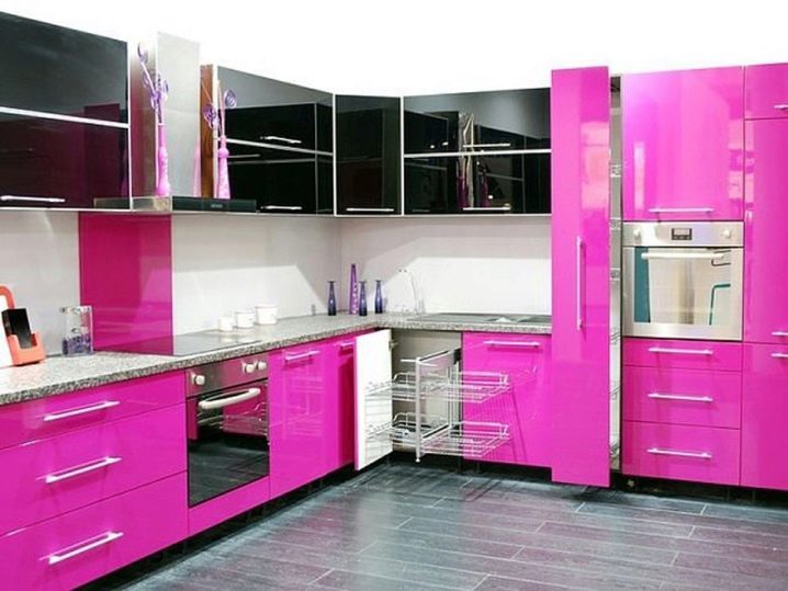 Чудесна комбинация за кухня с тъмен под ще бъде трио: сиво, черно, розово. Грей ще действа като неутрализатор тук, тоест ще балансира другите цветове, правейки черното по -малко сериозно, а розовото по -малко натрапчиво..