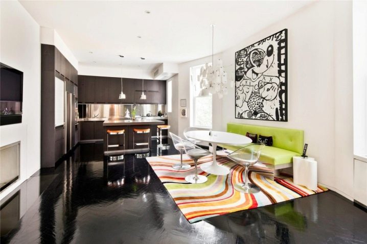 В студио апартамент, където кухнята и холът са комбинирани, тъмният под може да се коригира със светъл килим в хола.